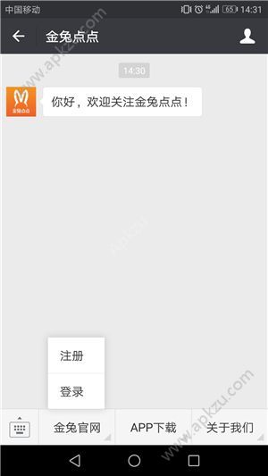 2、进入到公众号以后,点击页面下方的“金兔官网”,选择“注册”,如下图所示;