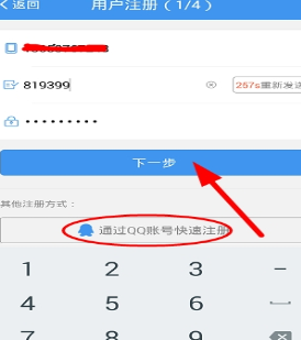 2、然后输入手机号,待手机获取验证码之后,填入验证码,然后点击“下一步”(也可以使用QQ账号快速注册哦);