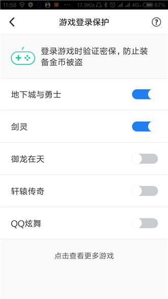 3、在这里你可以看到丰富的游戏保护功能,比如地下城与勇士、剑灵、英雄联盟等游戏的保护,选择你想要保护的游戏点击打开!