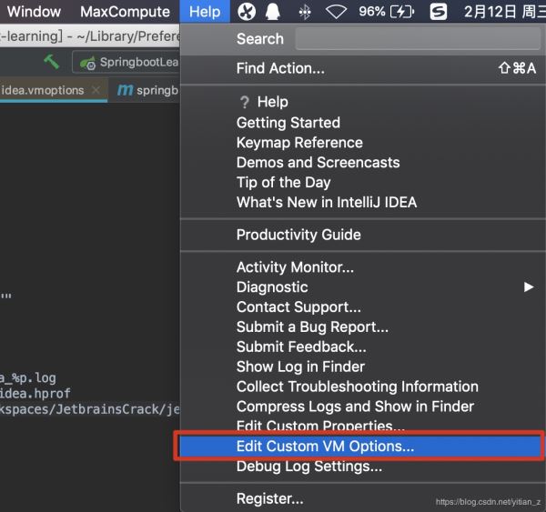 在网上搜索相应的破解文件,并将其存放在如下路径: Documents/IDEAWorkspaces/JetbrainsCrack/jetbrainsCrack.jar。 打开IDEA中的如下VM Options选项: 在打开的内容中,加入如下的配置: -javaagent:/Us