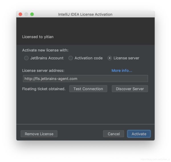 注意:如果经过以上过程,在使用IDEA过程中提示license过期或找不到license server的问题时。打开上述的register窗口,根据其中的提示更换相应的server address重新activate即可(这也是最近刚遇到的情况)。