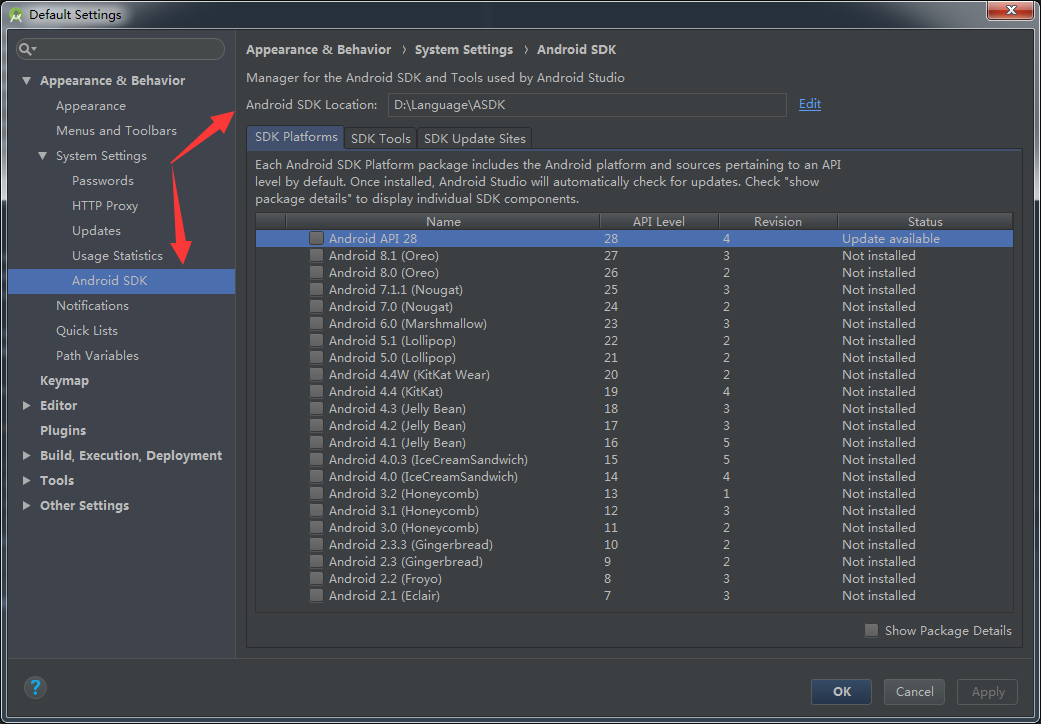 Android SDK安装完成后,新建ANDROID_HOME环境变量,值为上图Android SDK Location的目录(我这里是“D:\Language\ASDK”)