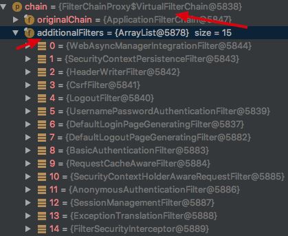 如果你看过我另一篇关于SpringSecurity初始化源码的博客,那么你一定知道当SpringSecurity项目启动完成后会初始化一个 springSecurityFilterchain 它内部 additionalFilters属性初始化了很多Filter 如下