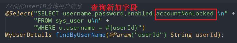 该字段被更新为0之后,用户下次登录会从sys_user加载UserDetails数据。所以MyUserDetailsServiceMapper查询SQL增加字段