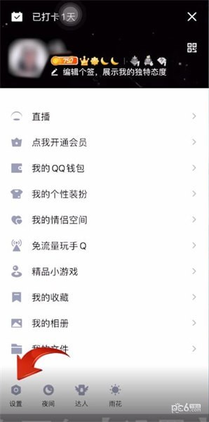 第一步:打开并登录手机QQ,然后点击左上角个人头像,点击左下角【设置】图标,
