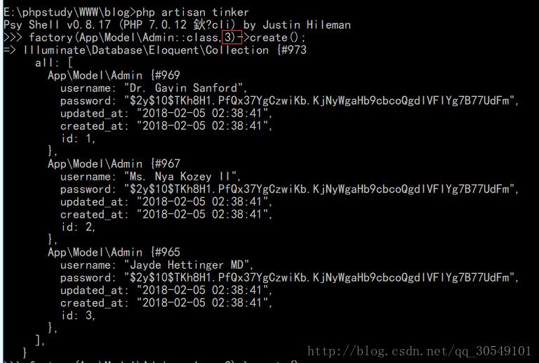 之后运行php artisan tinker 命令 里面输入 factory(模块命名,条数);