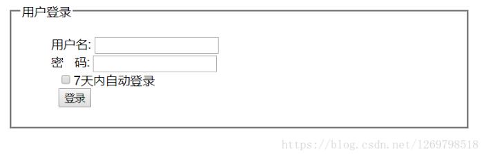 <form action="login.php" method="post"> <fieldset> <legend>用户登录</legend> <ul> <li> <label>用户名:</label> <input type="text" name="username"> </li> <li> <label>密 码:</label> <input type="password" name="password"> </li> <li> <label> </label> <input type="checkbox" name="remember" value="yes">7天内自动登录 </li> <li> <label> </label> <input type="submit" name="login" value="登录"> </li> </ul> </fieldset> </form>