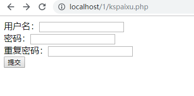 <form action="connet.php" method="POST" > 用户名:<input type = "text" name = "username"/> <br /> 密码:<input type = "password" name="password"/> <br /> 重复密码:<input type = "password" name="repassword"/><br /> <input type = "submit" value = "提交"/> </form>