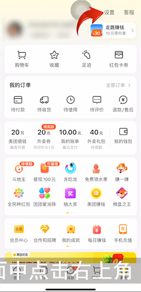 第一步:打开美团app,点击右下角【我的】,点击右上角【设置】,