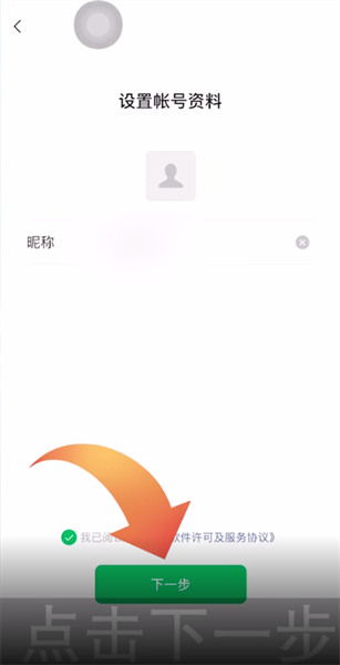 第五步:同意协议条款,点击下一步,输入昵称和头像,再同意服务协议,点击下一步,