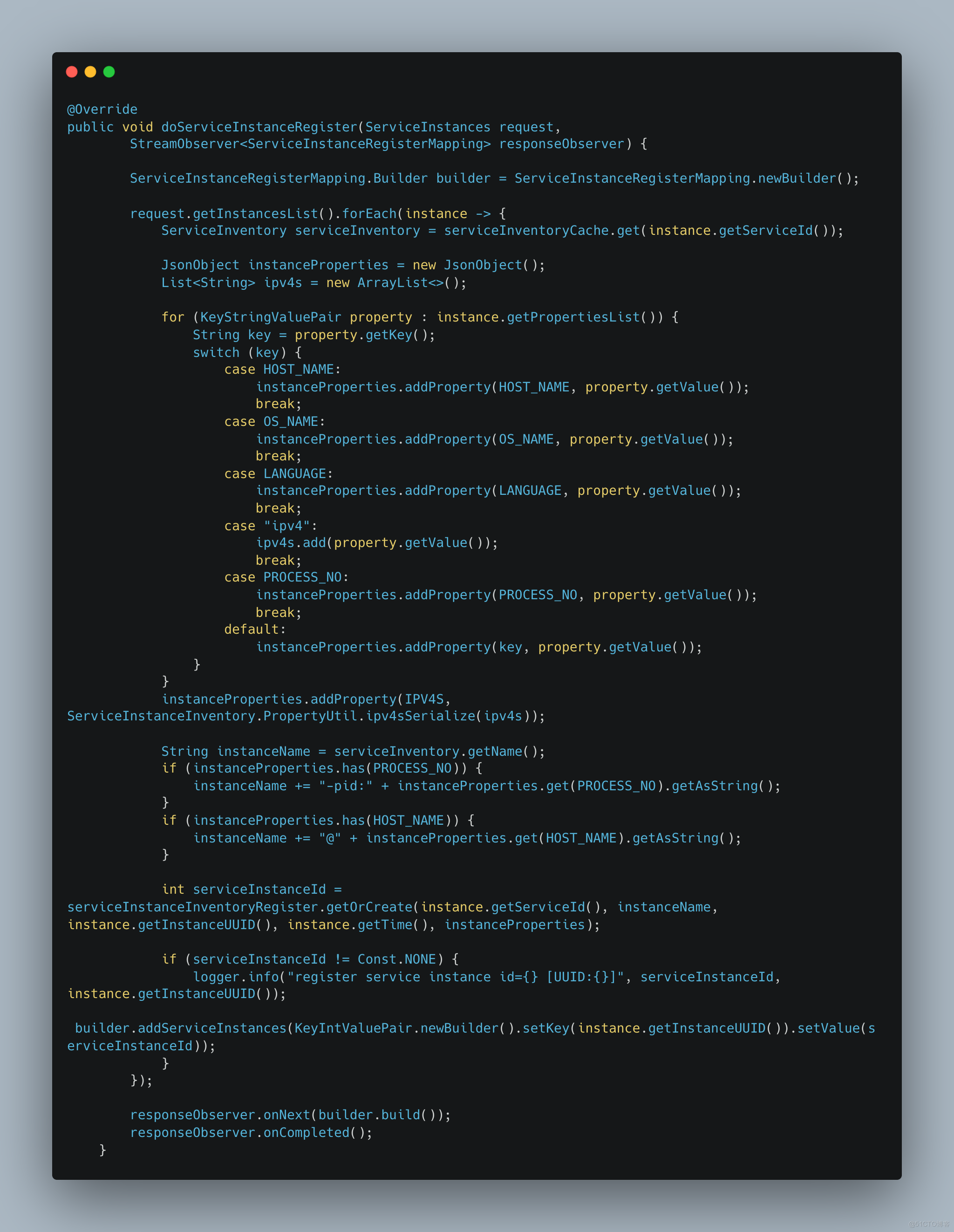 @Override public int getOrCreate(int serviceId, String serviceInstanceName, String uuid, long registerTime, JsonObject properties) { if (logger.isDebugEnabled()) { logger.debug("Get or create service instance by service instance name, service id: {}, service instance name: {},uuid: {}, registerTime: {}", serviceId, serviceInstanceName, uuid, registerTime); } int serviceInstanceId = getServiceInstanceInventoryCache().getServiceInstanceId(serviceId, uuid); if (serviceInstanceId == Const.NONE) { ServiceInstanceInventory serviceInstanceInventory = new ServiceInstanceInventory(); serviceInstanceInventory.setServiceId(serviceId); serviceInstanceInventory.setName(serviceInstanceName); serviceInstanceInventory.setInstanceUUID(uuid); serviceInstanceInventory.setIsAddress(BooleanUtils.FALSE); serviceInstanceInventory.setAddressId(Const.NONE); serviceInstanceInventory.setMappingServiceInstanceId(Const.NONE); serviceInstanceInventory.setRegisterTime(registerTime); serviceInstanceInventory.setHeartbeatTime(registerTime); serviceInstanceInventory.setProperties(properties); InventoryStreamProcessor.getInstance().in(serviceInstanceInventory); } return serviceInstanceId; }同样的,我们看ServiceAndEndpointRegisterClient的run()方法中的逻辑,如果服务实例ID为空的话会一直进行重试,直到服务实例ID不为空