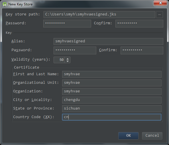 注:给我们自己开发的app签名,就代表着我自己的版权,以后要进行升级,也必须要使用相同的签名才行。签名就代表着自己的身份(即keystore),多个app可以使用同一个签名。