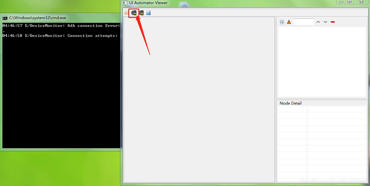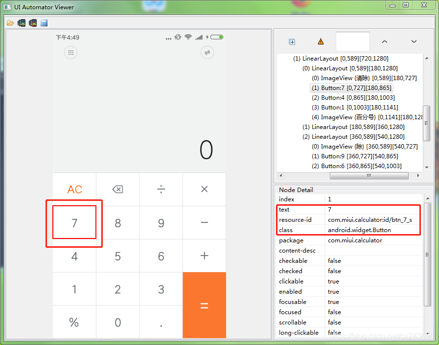 打开手机app,例如计算器,USB连接电脑,点击uiautomatorviewer左上角的安卓机器人按钮Devices Screenshot按钮刷新页面