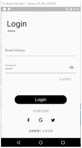 屏幕中上方是填写帐号以及密码的2个输入框,密码输入框有隐藏和显示密码的按钮.