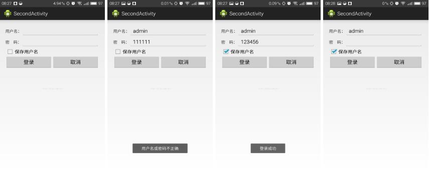 <RelativeLayout xmlns:android="http://schemas.android.com/apk/res/android" xmlns:tools="http://schemas.android.com/tools" android:layout_width="match_parent" android:layout_height="match_parent" android:layout_marginLeft="20dp" android:layout_marginRight="20dp" tools:context=".SecondActivity" > <LinearLayout android:layout_width="match_parent" android:layout_height="wrap_content" android:layout_marginTop="20dp" android:orientation="horizontal" > <TextView android:id="@+id/tvName" android:layout_width="wrap_content" android:layout_height="wrap_content" android:text="用户名:" /> <EditText android:id="@+id/etInputName" android:layout_width="wrap_content" android:layout_height="wrap_content" android:layout_weight="2" /> </LinearLayout> <LinearLayout android:layout_width="match_parent" android:layout_height="wrap_content" android:layout_marginTop="60dp" android:orientation="horizontal" > <TextView android:id="@+id/tvPass" android:layout_width="wrap_content" android:layout_height="wrap_content" android:text="密 码:" /> <EditText android:id="@+id/etInputPass" android:layout_width="wrap_content" android:layout_height="wrap_content" android:layout_weight="2" /> </LinearLayout> <LinearLayout android:layout_width="match_parent" android:layout_height="wrap_content" android:layout_marginTop="100dp" android:orientation="horizontal" > <CheckBox android:id="@+id/cbSave" android:layout_width="wrap_content" android:layout_height="wrap_content" android:checked="false" android:text="保存用户名" /> </LinearLayout> <LinearLayout android:layout_width="match_parent" android:layout_height="wrap_content" android:layout_marginTop="130dp" android:orientation="horizontal" > <Button android:id="@+id/btLogin" android:layout_width="wrap_content" android:layout_height="wrap_content" android:layout_weight="1" android:text="登录" /> <Button android:id="@+id/btCancel" android:layout_width="wrap_content" android:layout_height="wrap_content" android:layout_weight="1" android:text="取消" /> </LinearLayout> </RelativeLayout>