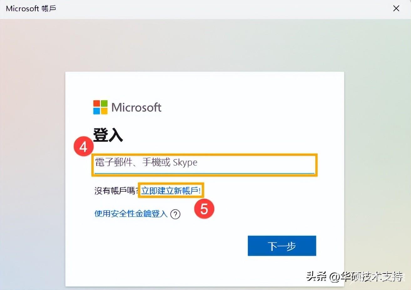 3, 请登入您用于其他Microsoft服务(如Outlook、Office等)的电子邮件、电话号码或Skype帐户④。如果您没有Microsoft账户,请点选[立即建立新账户!]