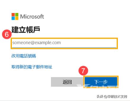 4, 请输入您的电子邮件信箱⑥(这个信箱将作为您的Microsoft账户登入账号),然后点选[下一步]⑦。 如果您没有电子邮件信箱,您也可以改用电话号码或是取得新的电子邮件地址。