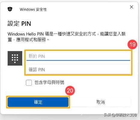 11,设定您要使用的PIN码⑲,然后点选[确定]⑳。此PIN码将会用于您之后登入Windows使用。