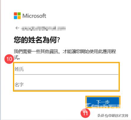 6,请输入您的姓氏与名字⑩,然后点击[下一步]⑪。