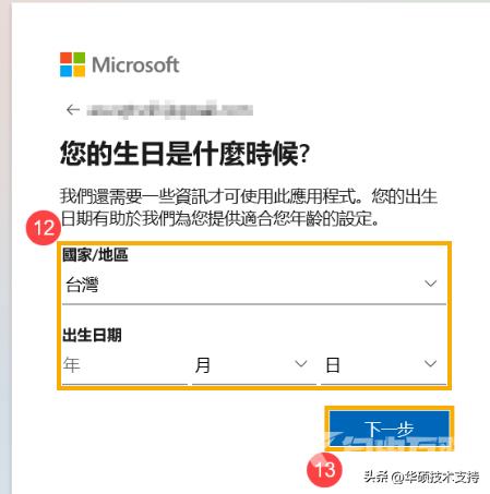 7,请输入您的国家/地区和出生日期⑫,然后点击[下一步]⑬。