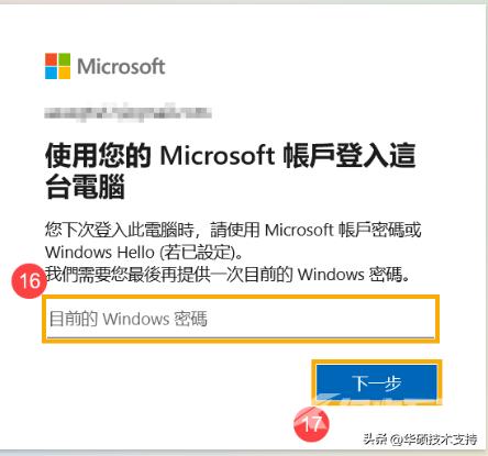 9,Microsoft账户建立完成,当您下次登入计算机时,将会使用Microsoft帐户及密码登入。在此之前,请先输入您原本使用本机帐户登入Windows的密码⑯,然后点击[下一步]⑰。 如果您的本机账户没有设定密码,请不要输入任何字符,直接点选下一步即可。