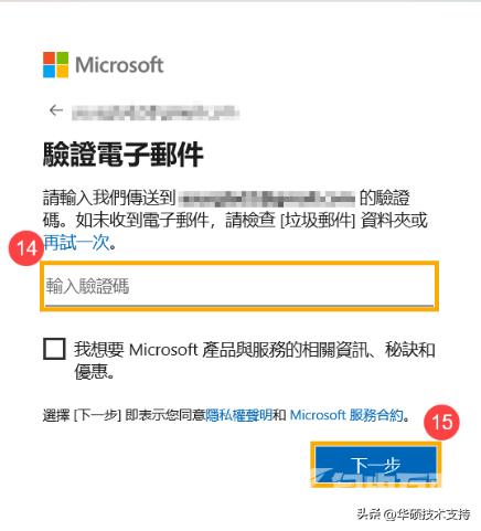 8,Microsoft将会寄一封验证电子邮件到您的电子邮件信箱,请输入验证码⑭,然后点击[下一步]⑮。