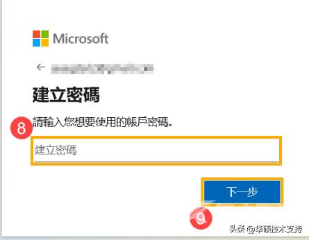 5,请输入您想要使用的Microsoft帐户密码⑧,然后点击[下一步]⑨。