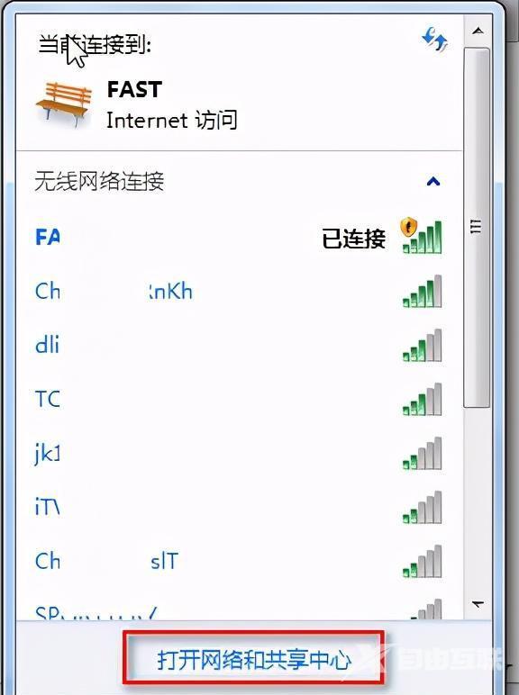 系统右下角打开网络和共享中心,如图,我的为无线路由连接,所以点击无线图标,弹出的对话框点击打开网络和共享中心