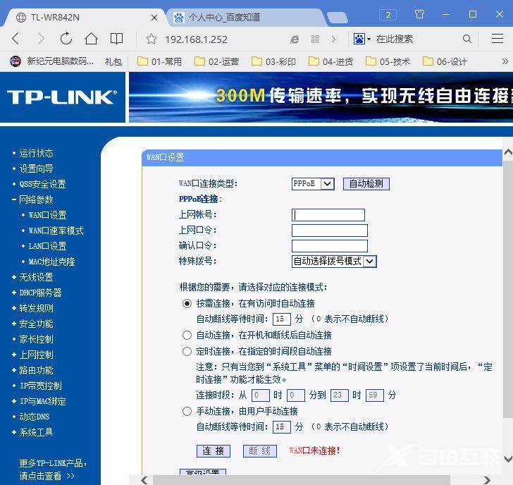 一般宽带用户都是拨号连接方式,所以点左边的“网络参数”-WAN口设置,在右边的窗口中选择“WAN口连接类型”为PPPoE",在下面的上网帐号中输入宽带服务商给你的宽带帐号及密码。输入完成后,点下面的“连接”,如果连接成功,则“连接”会变成灰色,“断线”会变成黑色。这时表示路由器连外网成功了!这时要记得保存。