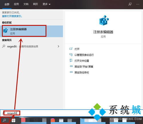 1.使用桌面左下角开始旁边的“搜索”在里面输入“regedit”并点击进入;