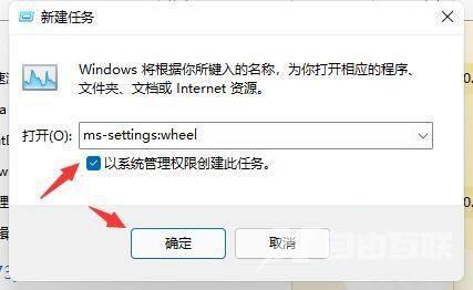 3、接下来我们勾选“以系统管理权限创建此任务”选项,输入指令“ms-settings:wheel”,回车“确定”;