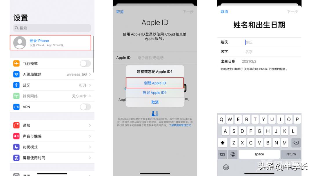 如果在设置新iPhone的情况下,没有进行Apple ID的注册,即可在设置中进行注册。打开【设置】-【登录iPhone】-【没有或忘记Apple ID?】-【创建Apple ID】,再根据页面提示填写姓名、出生日期、手机号等信息。
