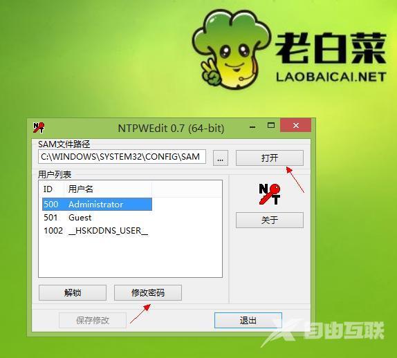 8,点打开,选择你要破解的用户名,点击修改密码,输入两遍,确认然后重启电脑用新的密码登录就大功告成了。(这里注意旁边地解锁我点然后启动还是需要输入密码,具体什么情况就不研究了)