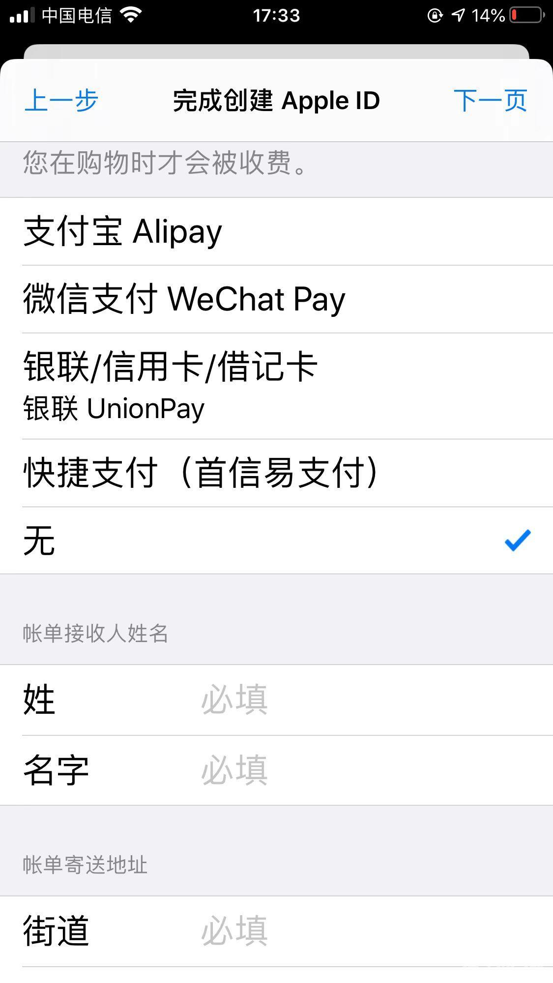 因为新注册的id还没有在苹果商店使用下载过,会提示检查账户信息,点击检查,把必填的选项都填进去,地址,其他选项可以不填,付款方式这里,如果只是单存下载软件,那就直接选‘无’,避免产生不必要的费用。
