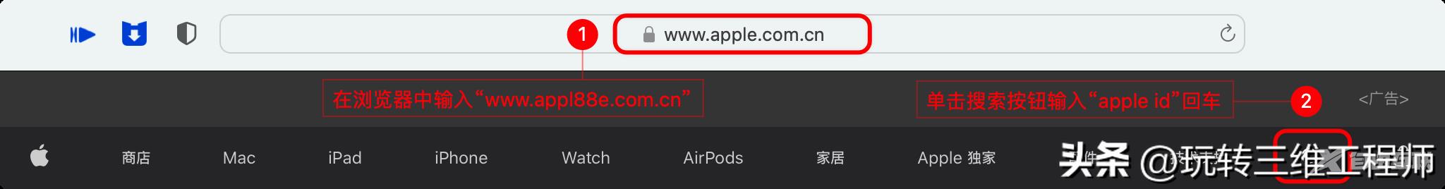 步骤一:将浏览器输入苹果官网地址:https://www.apple.com.cn,按下图步骤执行,如图1-1所示。