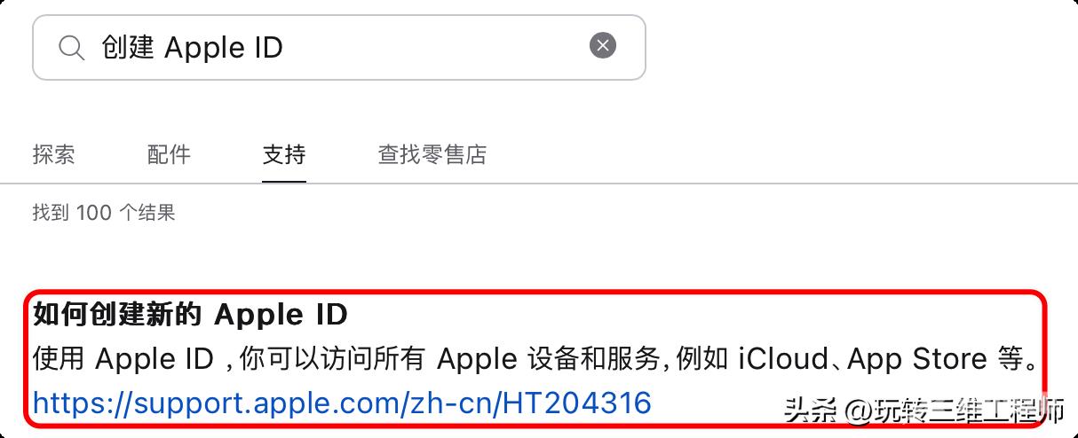 步骤二:点击“搜索”按钮,在对话框输入“apple id”,选择“创建Apple ID”,如图1-2所示。