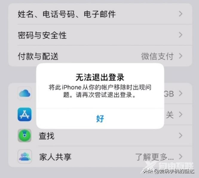 退出时会弹窗提示“将此iPhone从你的账户移除时出现问题,请再次尝试退出登录”。