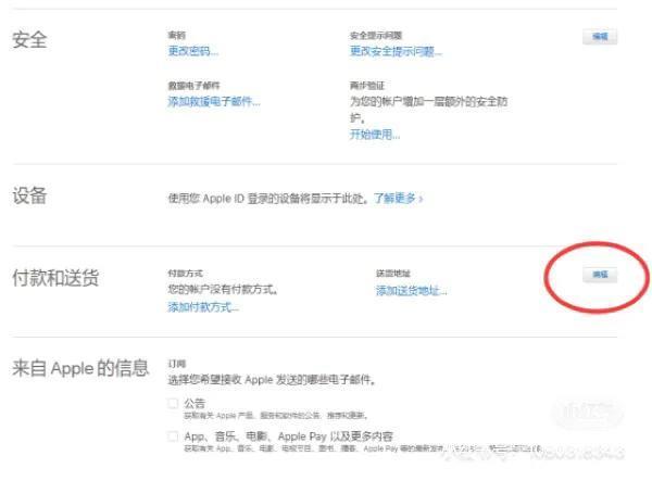 4, 回到苹果官网,右上角点账户,账户设置找到管理Apple ID,往下拉找到“付款和送货”这个大的项目,点击右侧的“编辑”.