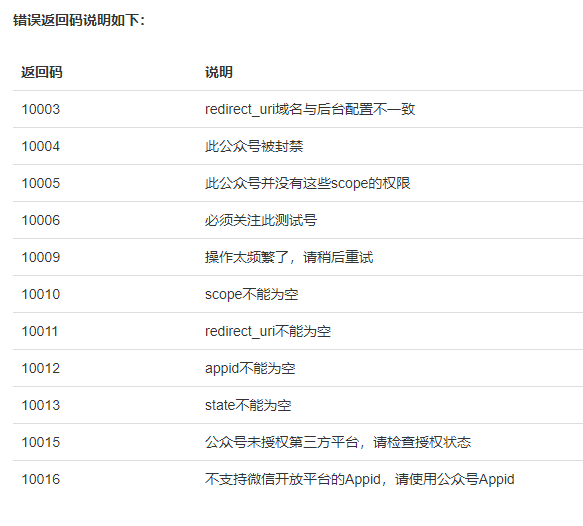 如果用户同意授权,页面将跳转至 redirect_uri/?code=CODE&state=STATE,若跳转错误请根据日志输出的错误码在官网上查看相应的说明,附上官网上错误返回码说明:
