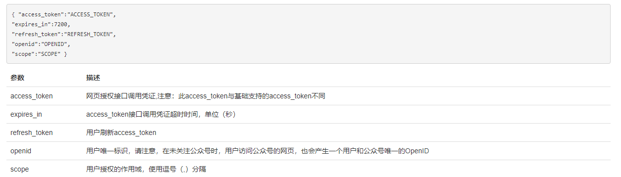 需要的参数为开发者ID(AppID),开发者密码(AppSecret),和获取到的code。正确返回json数据包为: