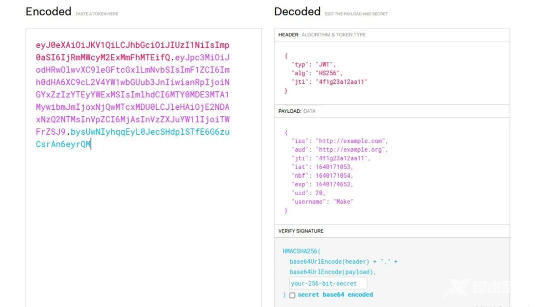 使用https://jwt.io/这个网站对JWT Token进行解析的结果如下