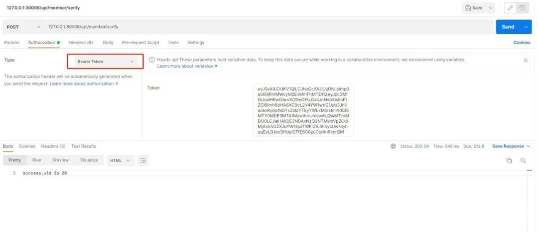 - 验证令牌验证这个Token是不是合法的,有没有过期等,并可以解析出subject和claim里面的数据,传递jwt token的方式为Authorization中的Bearer Token,如下