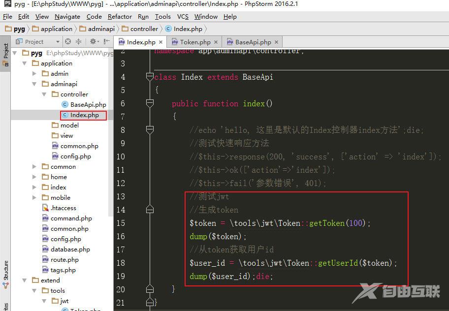 静态调用封装的\tools\jwt\Token类的getToken方法,传递一个用户id值,生成token