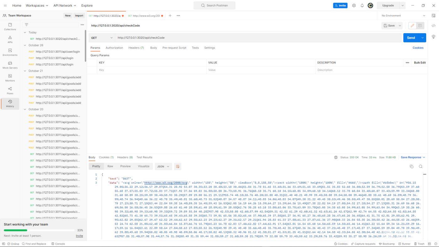 获取验证码的方法是访问后端接口/checkCode,这个接口返回两个值(后端补充说明),一个是text,一个是data,text就是验证码的字符串值,data是验证码的html地址,在postman中测试返回的结果如下: