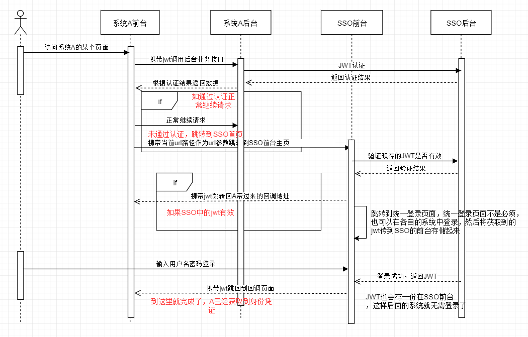 这个办法就是回调。系统 A 的前台在跳转到 SSO 的前台时,将当前路径作为 url 参数传递给 sso 前台,sso 前台在获取到 jwt 后,再跳转到系统 A 传过来的 url 路径上,并带上 jwt 作为 url 参数。这就完成了 jwt 的一次共享,从 sso 共享到系统 A。
