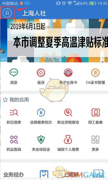 1、进入上海人社app首页后,点击左上角的‘个人’图标
