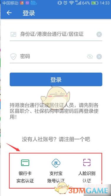 2、进入到登录页面,点击下方的三种认证方式其中一种即可:银行卡、支付宝、人脸识别