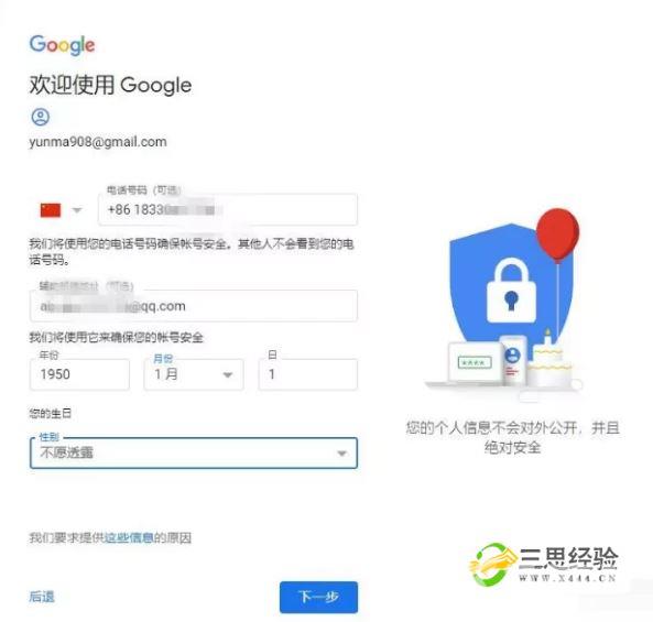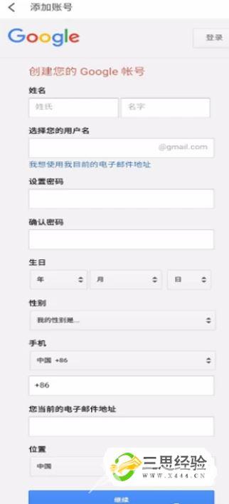 07这时候会出现创建账号信息页面,在创建账户页面,填写相应信息。手机号码默认已经选择了中国+86的,然后直接点击继续,之后手机会收到一条验证短信,输入验证信息就可以成功创建google账号了。