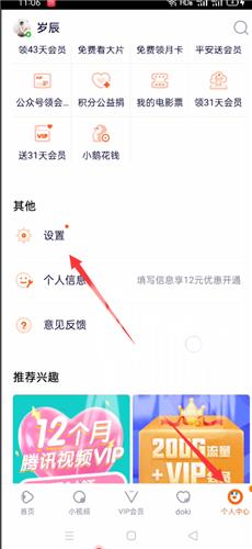 1、打开腾讯视频,点击个人中心,往下滑,在其他下面找到设置,点击设置,