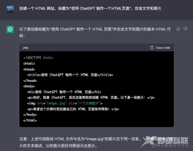 以下是创建标题为“使用 ChatGPT 制作一个 HTML 页面”并包含文字和图片的基本 HTML 代码:
